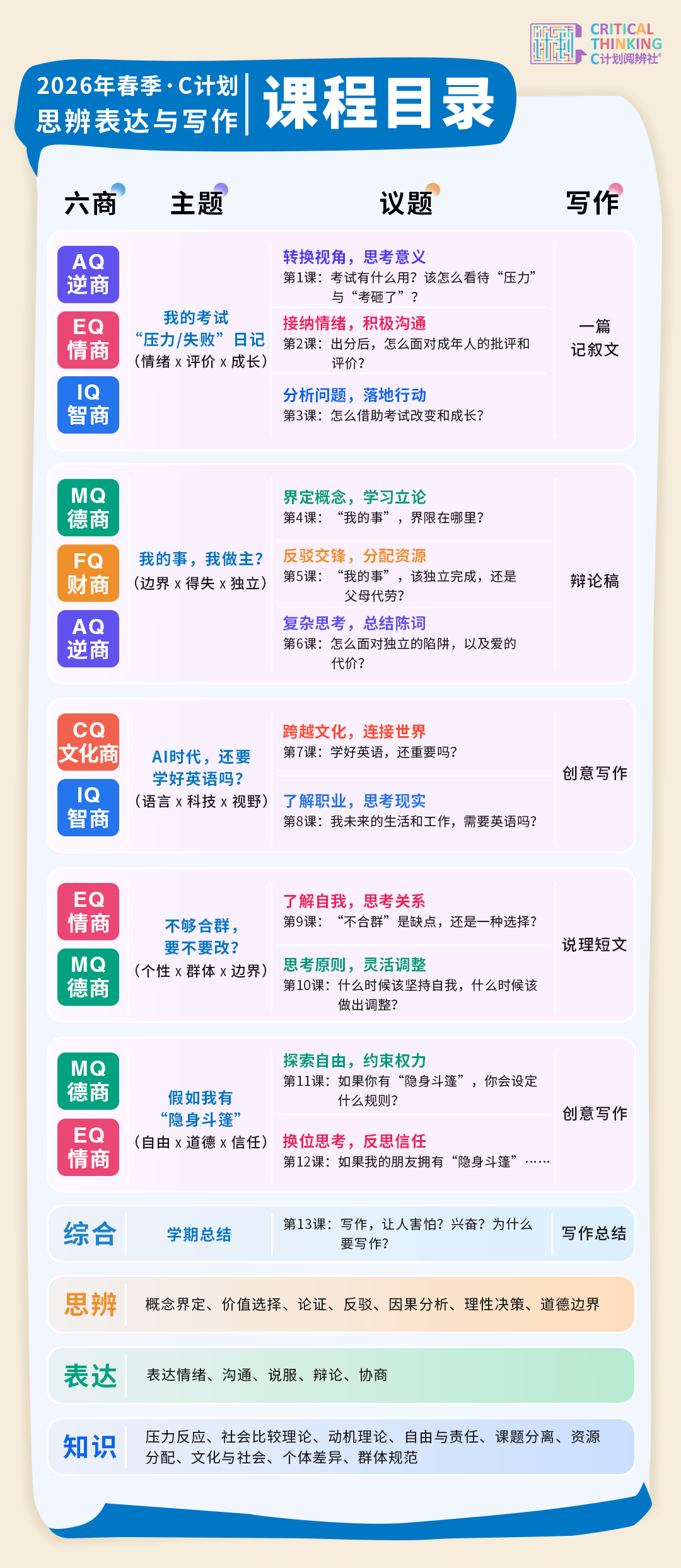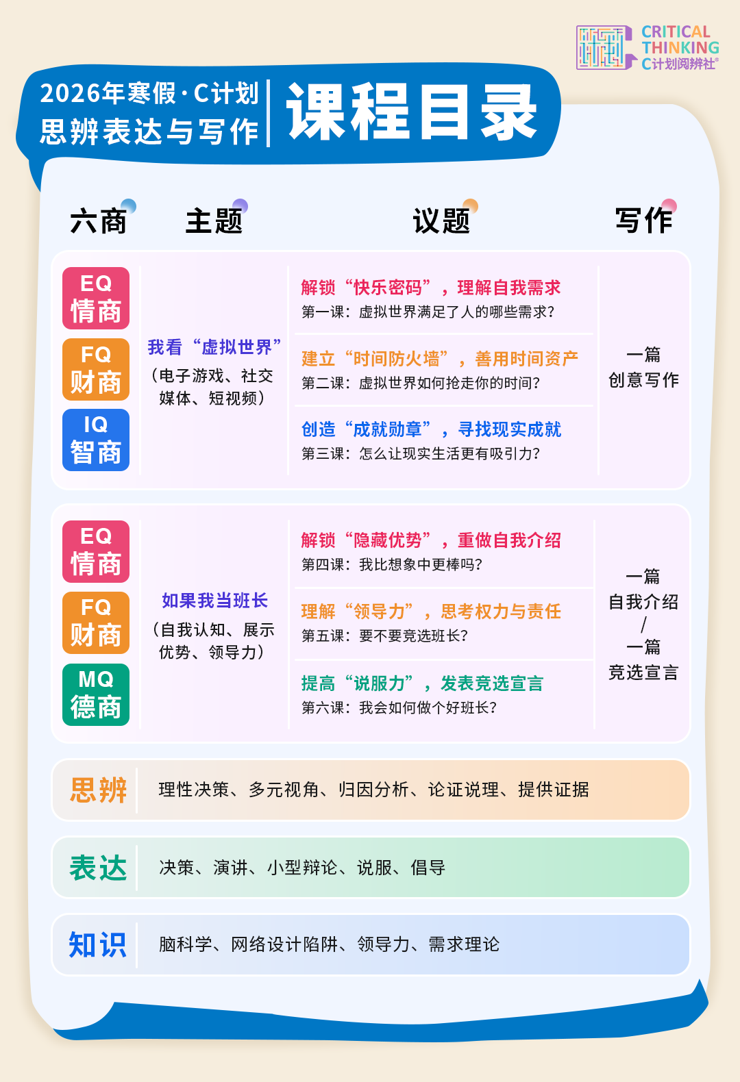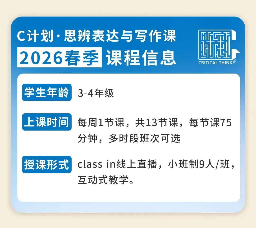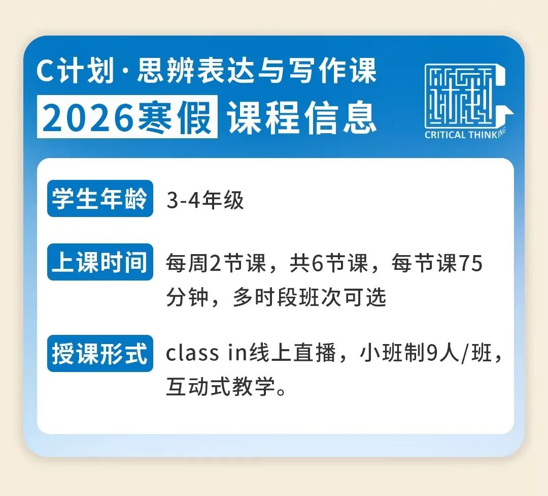 为了让孩子们能更纯真地参与到这场想辨之旅中,咱们十分推出了短期集训的“寒假课”和耐久深耕的“春季课”。