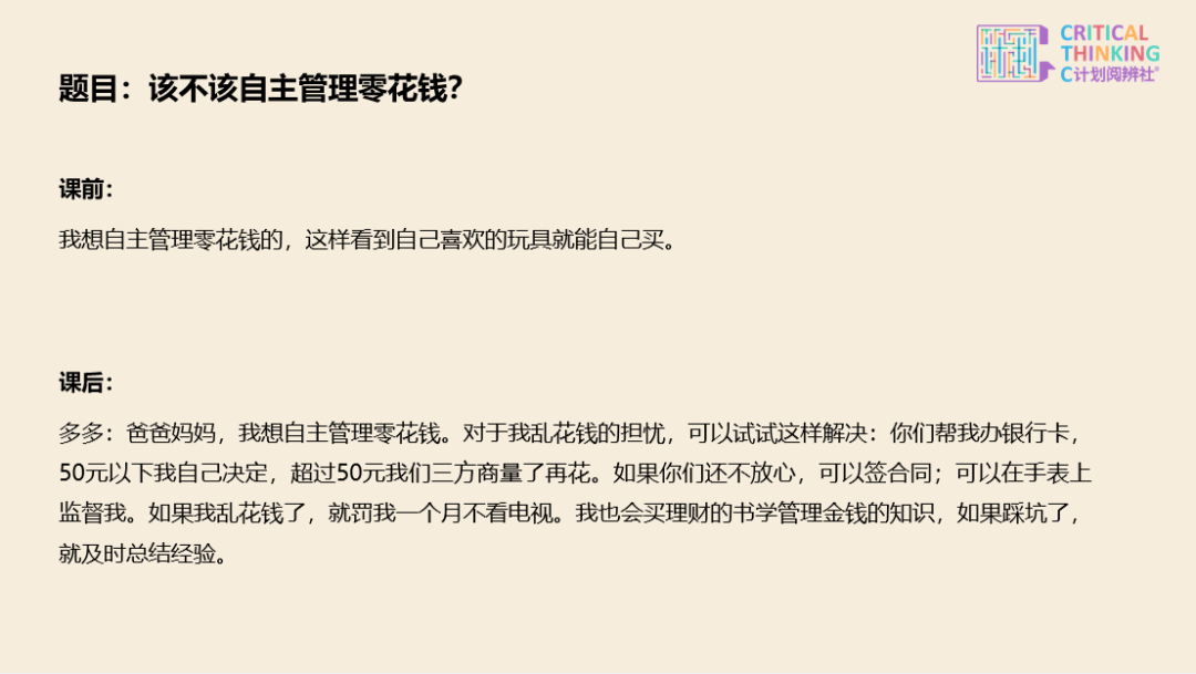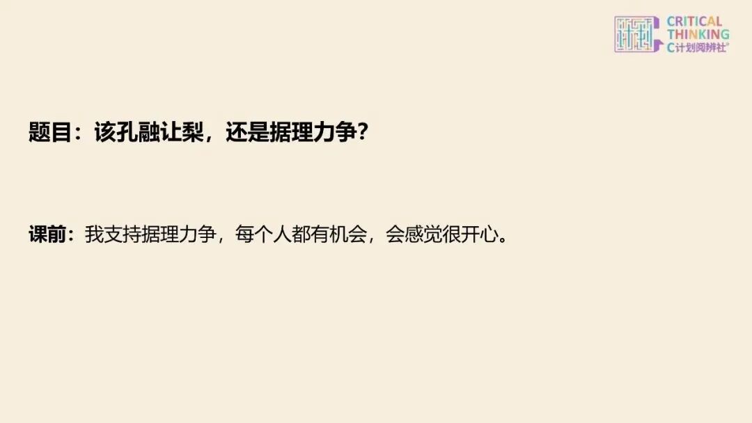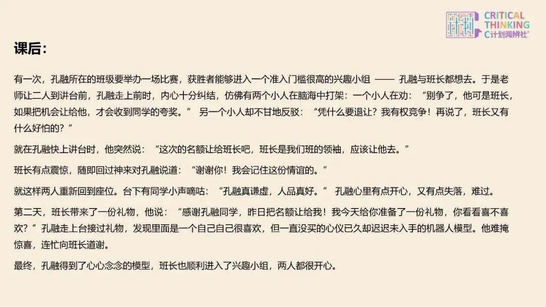 而在 C 揣摸这堂课上,咱们带孩子跳出非黑即白的知道:先权衡 “该辞谢,照旧该争取?”,听孩子们暴露最确凿的想法——有东说念主执着于 “辞谢有好报”,有东说念主直言 “争取才本旨”;