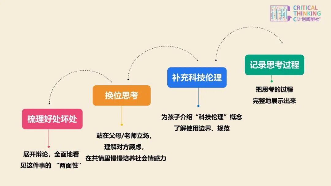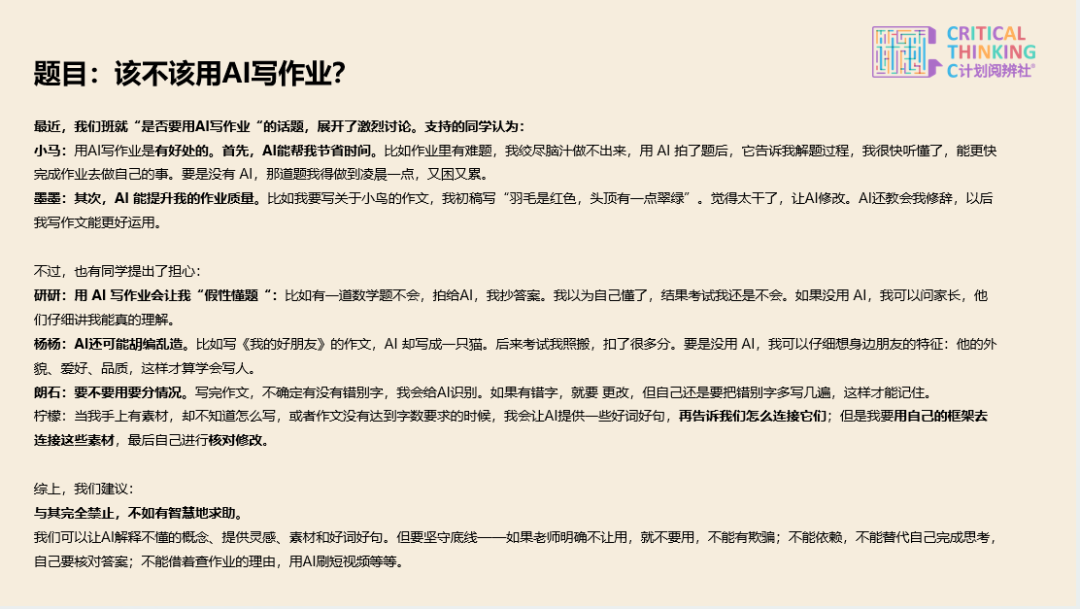 咱们的主义,不是让孩子得出“要”or“不要”的通俗论断,而是让孩子看到使用AI的方式、规模,相识“本事如何为我所用”。并熟练运用想辨器具。