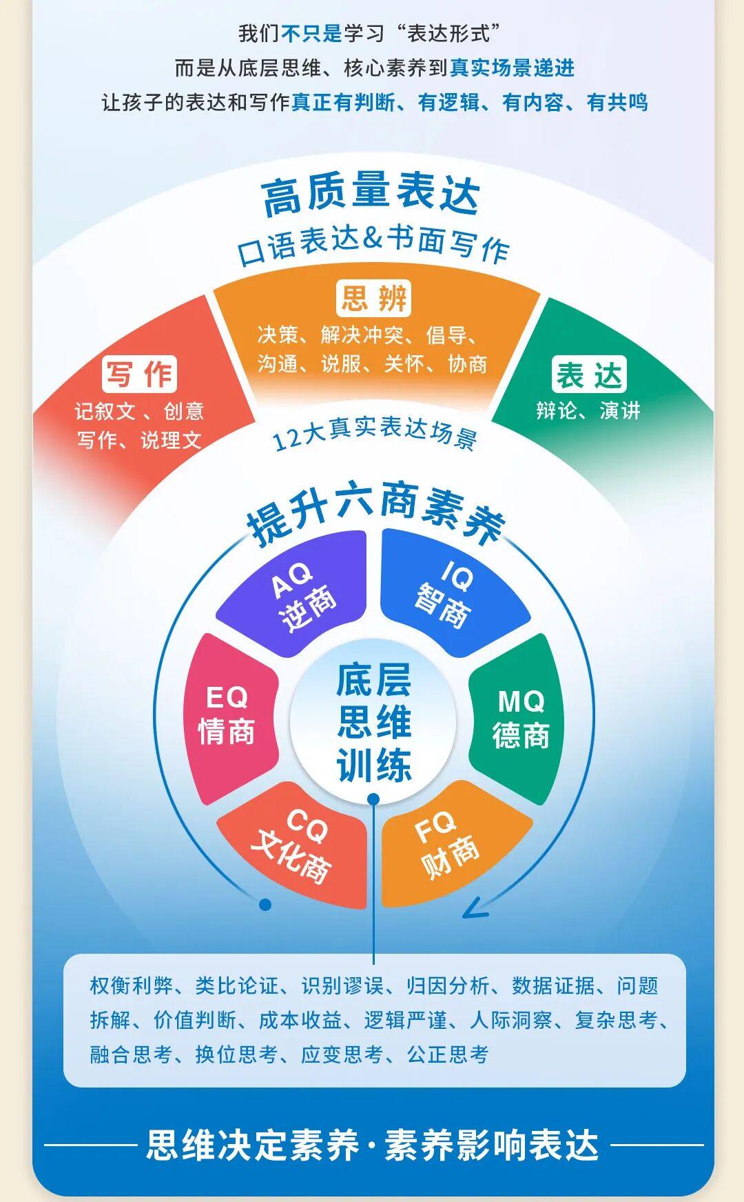 这四大模块,皆围绕“六商”主题伸开——才能IQ、情商EQ、逆商AQ、德商MQ、财商FQ、文化商CQ——咱们校服,确凿影响抒发质地的,从来不是好词好句的荟萃和抒发套路模板,而是底层想维才能、阵势韧性、抗挫力、对他东说念主和宇宙的深度相识力。