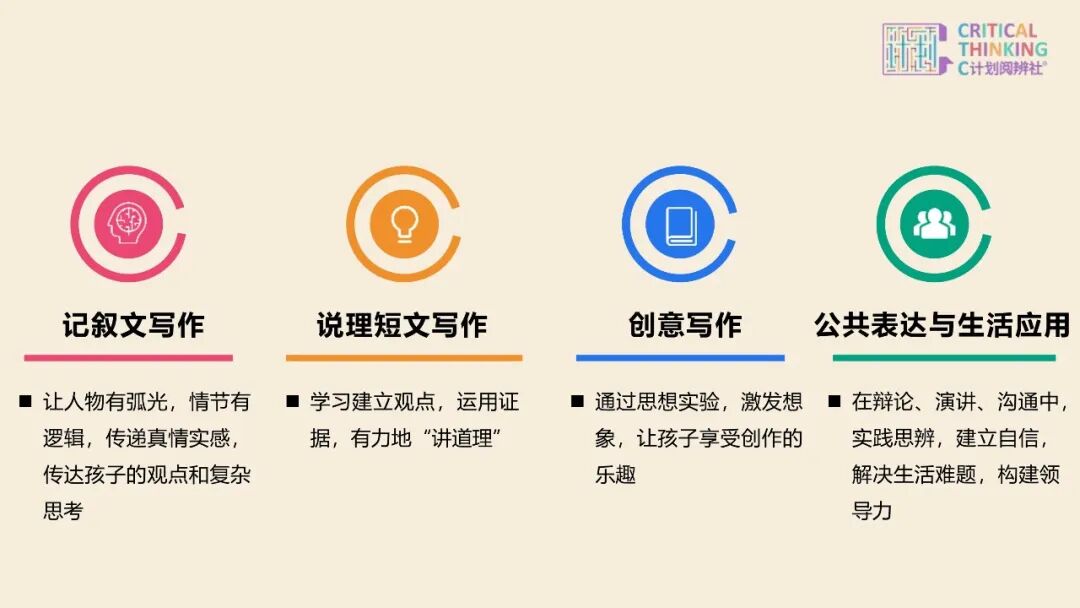 正因为看清了 “想辨力是抒发的中枢复古”,也懂家长对孩子改日的深层盼望,C 揣摸但愿通过一套自主研发的抒发课,系统性地匡助孩子打破抒发逆境:确凿将 “想考” 注入 “写稿”。