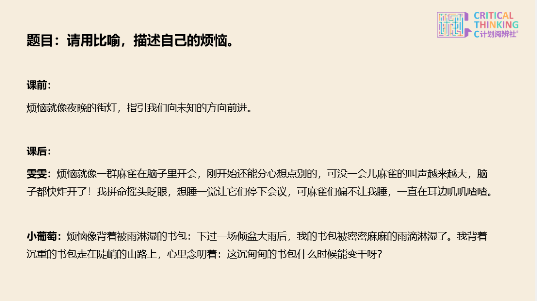 3. 若孩子因抗击阅读而影响学习意愿,进而死亡想辨课的学习,不妨从【想辨抒发课】动手,先守住想考兴致,再逐渐打破阅读封闭。